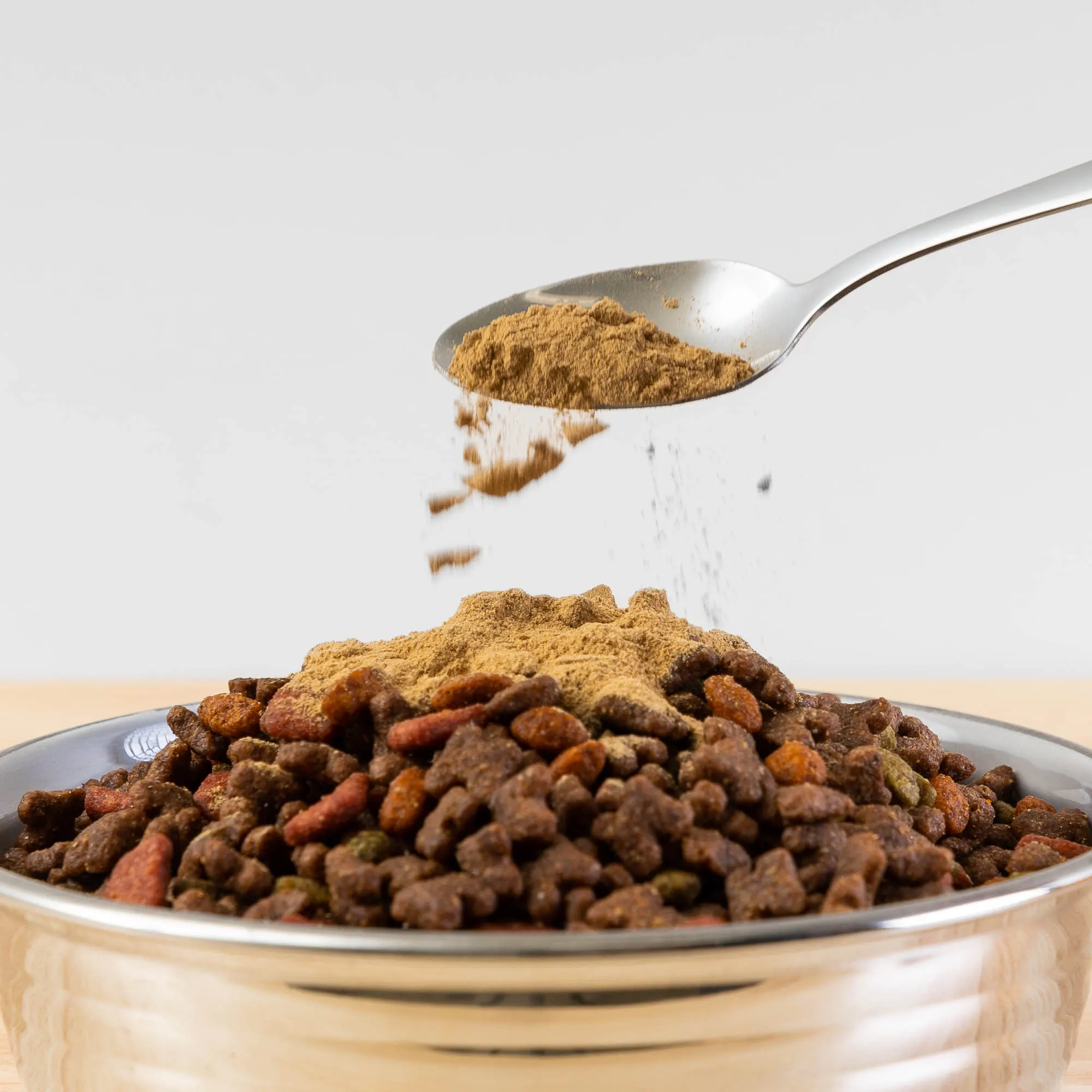 Giving Gold Mushroom Bone Broth is easy! Just sprinkle over your dog’s existing food. The tasty powder boosts the flavor and nutrition of any dog food!